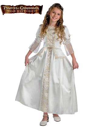 Her wedding day ruined thanks to the East India Trading Company!Can Elizabeth pass as a pirate? She has little choice as she must find Will Turner and save him from Jack Sparrow's fate. This adorable long white gown has elegant gold metallic detailing and shimmering puffy sleeves with sheer ruffles and attached petticoat make this dress perfect for a party or just playing dress-up. This is an officially licensed ©Disney, Pirates of the Caribbean costume. List Price : $46.99Our Price : $34.67